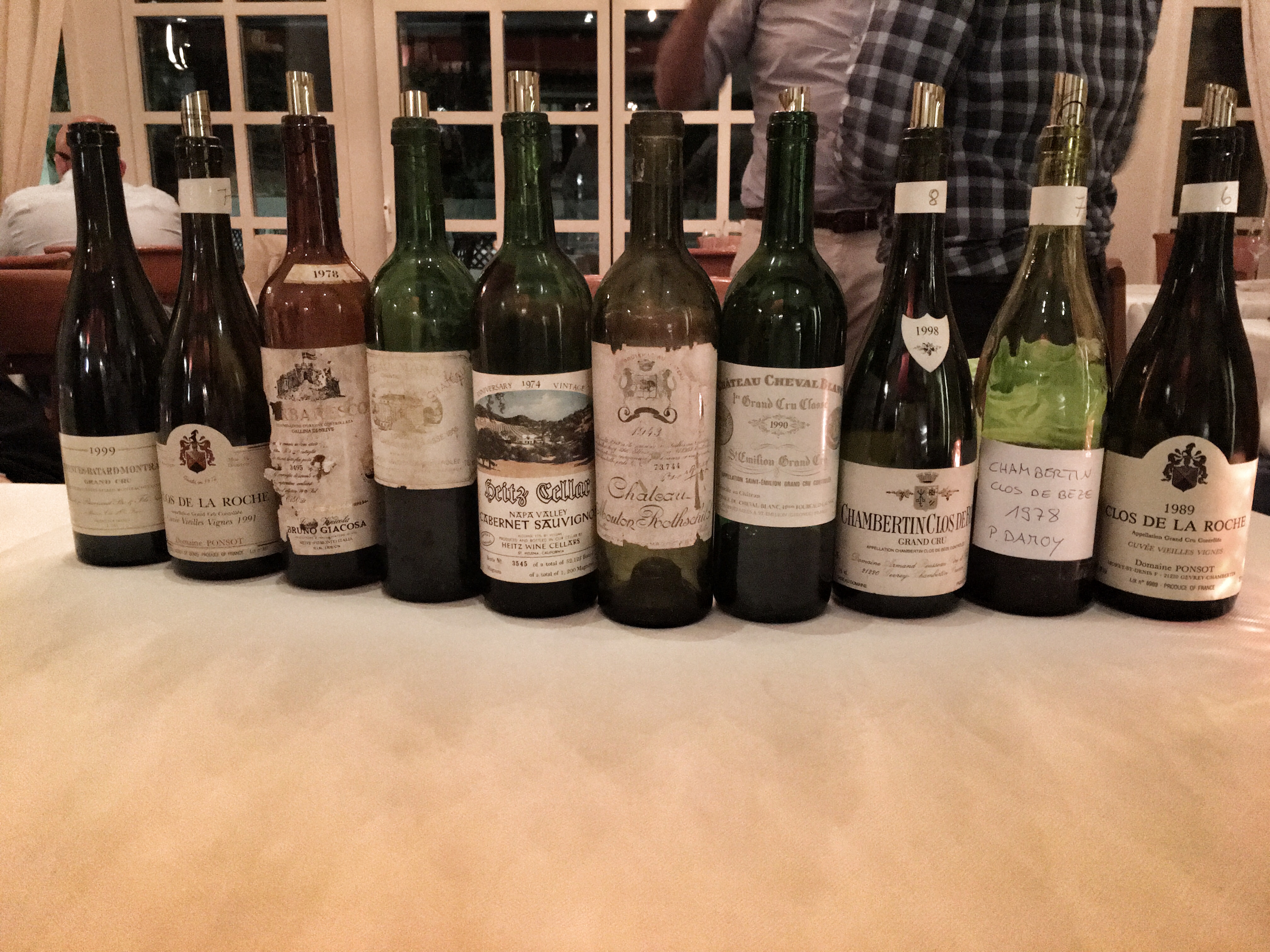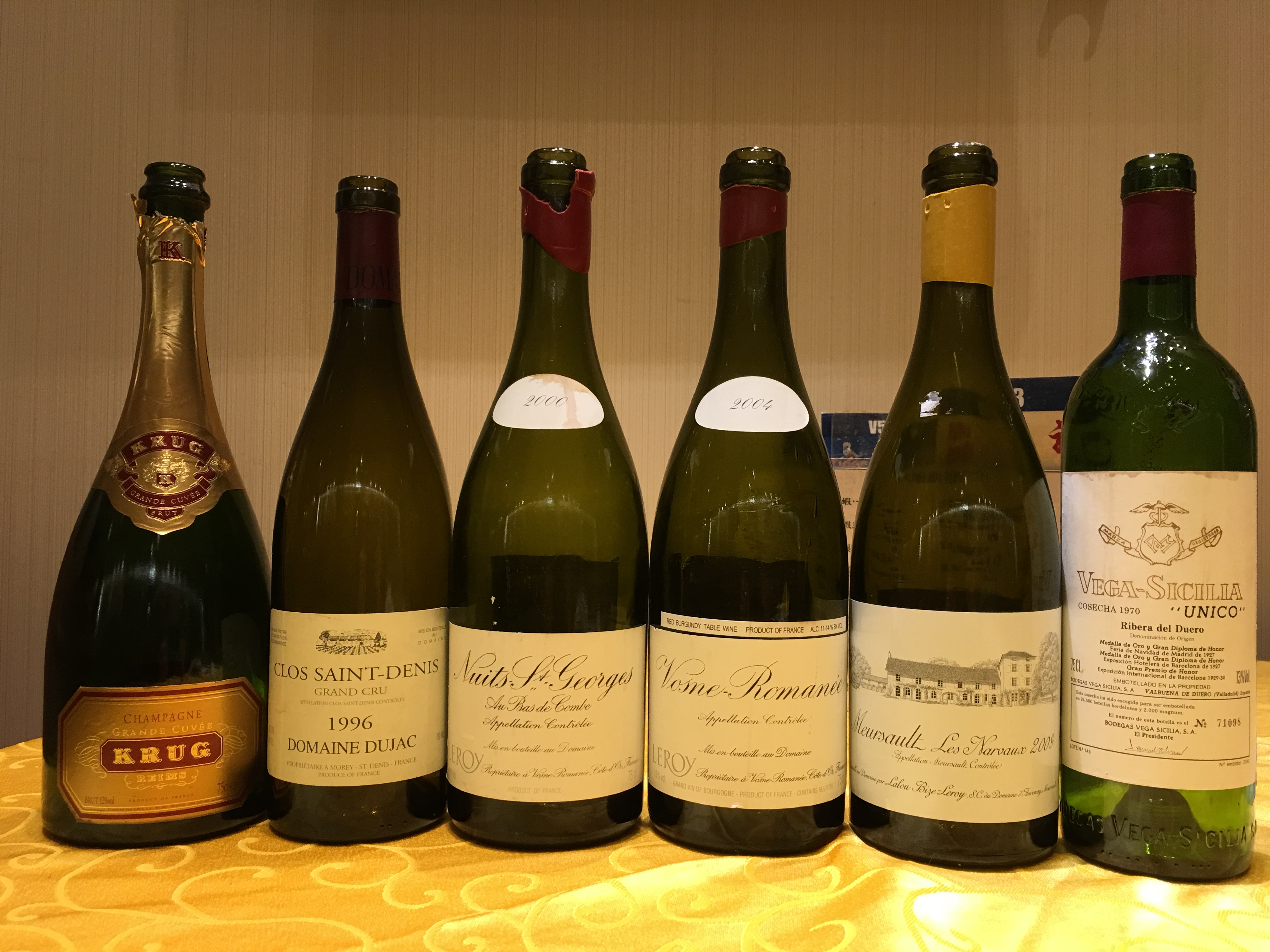 2002 Soldera Riserva, 1993 Vogue Musigny Blanc (ex-domaine), 1998 Petrus, 2004 Coche Dury Puligny Montrachet Les Enseigneres, 2005 Jacques Selosse, 1995 DRC Romanee St Vivant, 1947 Mouton Rothschild, 1985 Krug, 2009 d’Auvenay Meursault Les Navaux, 2006 d’Auvenay Puligny Montrachet 1er Cru Les Folatieres, 1995 G. Roumier Bonnes Mares, 2000 Rousseau Chambertin, 1998 Conterno Barolo Monfortino, 1996 Krug, 1990 Cheval Blanc, 1996 Louis Jadot Montrachet, 1990 Margaux, 1970 Vega Sicilia, 2001 DRC Grands Echezeaux, 1955 Haut Brion, 1998 Rousseau Chambertin Clos de Beze